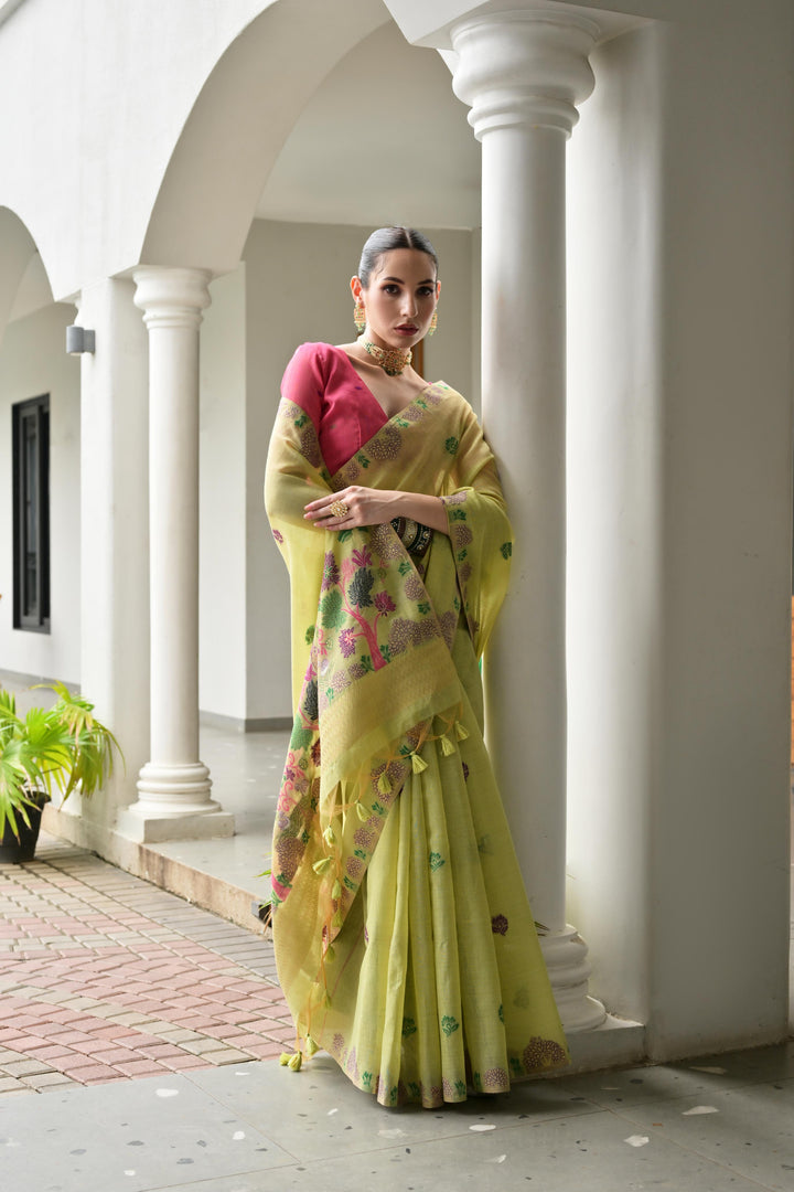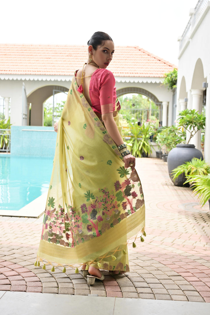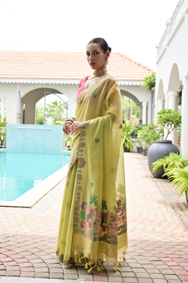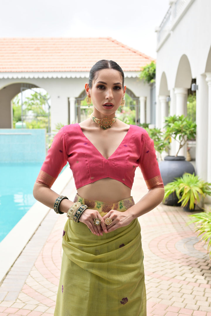 Premium Chanderi Cotton Saree - Pista