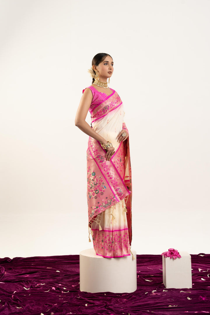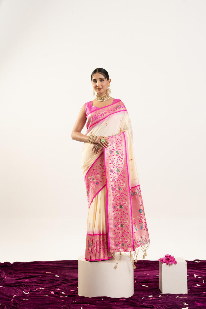 Premium Soft Muga Cotton Paithani Saree 101 - White